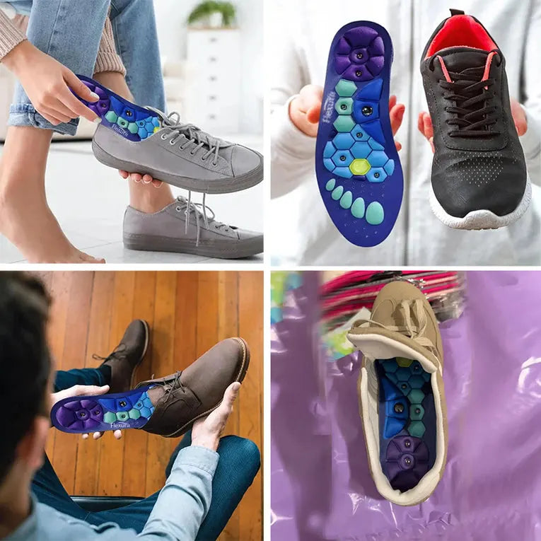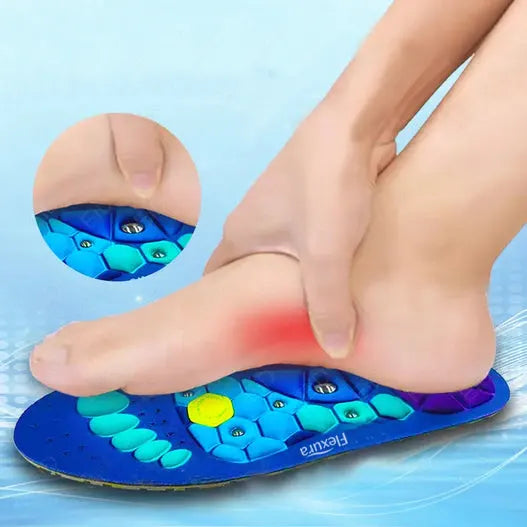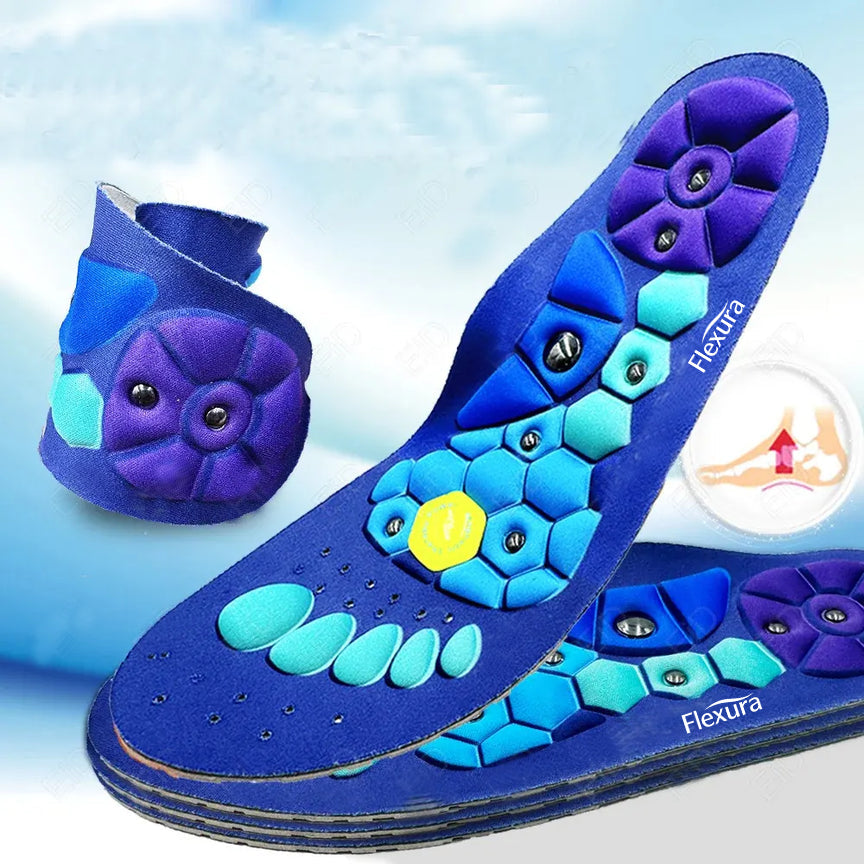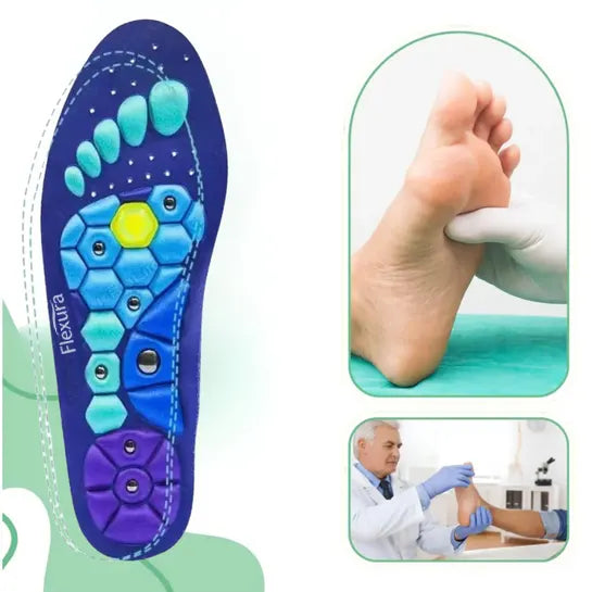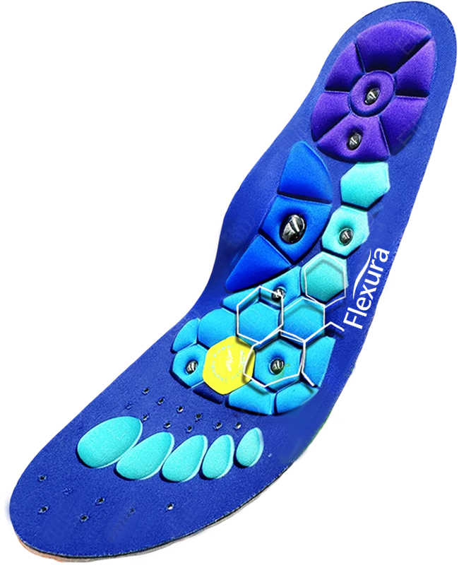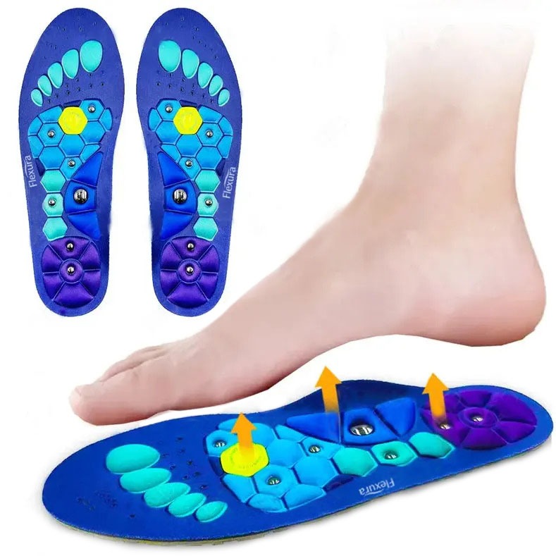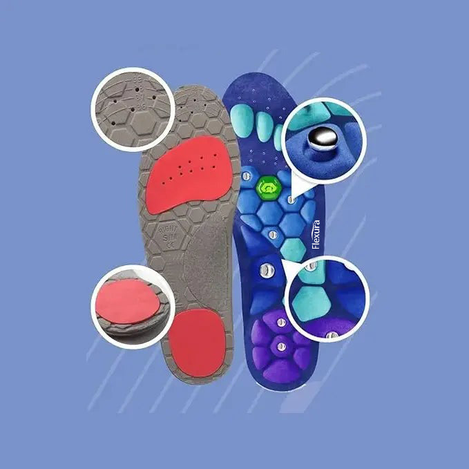 Several peer-reviewed studies indicate that Advanced arch support can improve All-day comfort and stimulate nerve endings in the feet. The embedded magnets in Flexura Insoles are strategically positioned to target key Targeted support, enhancing microcirculation and helping reduce inflammation and foot fatigue. Reflexology research suggests that applying gentle pressure to these specific points can alleviate pain not only in the feet but also in related areas such as knees, hips, and lower back.